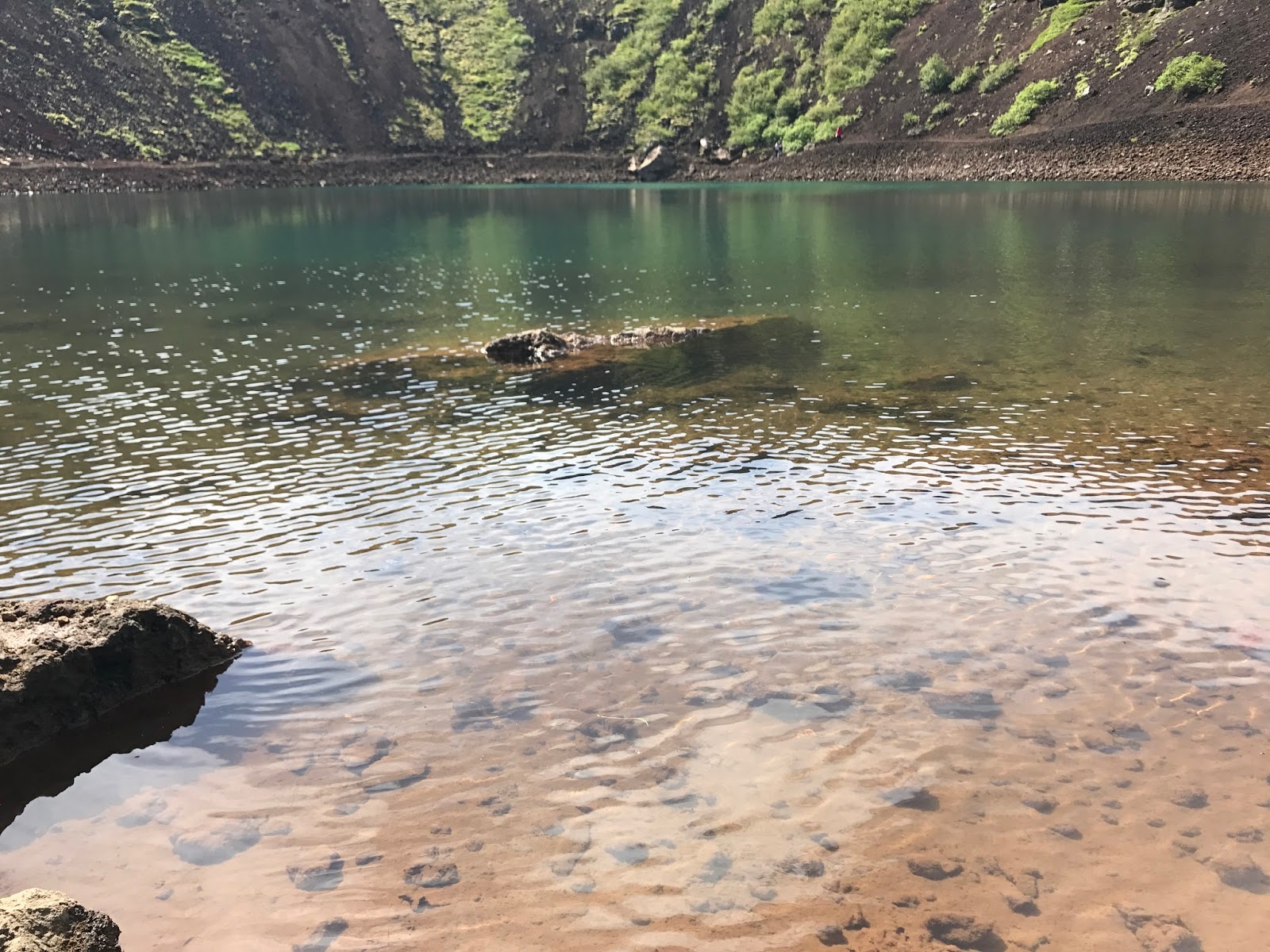 Next up was the Kerid Crater, which was pretty picturesque and the weather was lovely for a stroll. Of course, I had to take a tumble on all those pesky red gravel, tearing up my hand a bit (I still have a mark now over a week later). I didn't get seriously hurt but just the day previous I had done a skid over a wet floor (with a lack of sign) and slammed my elbow into an elevator to catch my wall, which had then hurt my shoulder as a consequence. Basically, I shouldn't be allowed to go outside. But I washed my hand in the clear water that the bottom of the crater and the boys and I tried (and failed) to skid rocks while Mum watched from above.